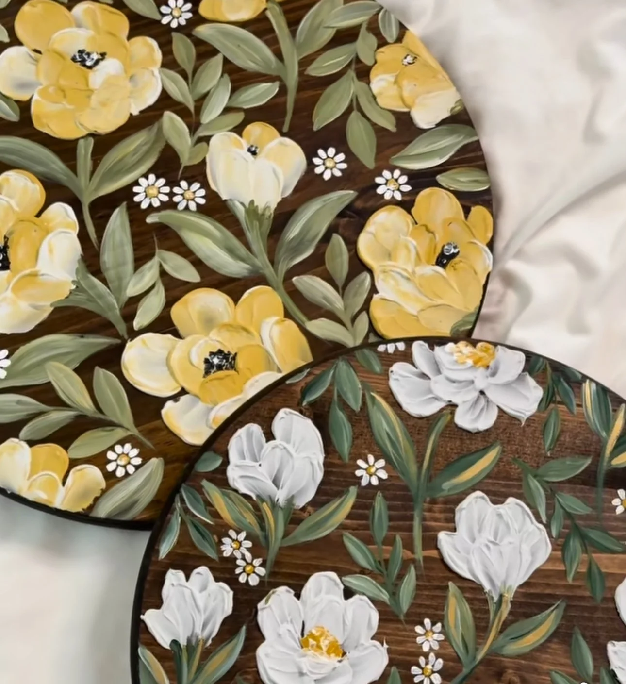 Working on wood as your surface adds an organic, grounding quality to the process—allowing the natural grain to interact with your floral forms and enhance the sense of depth and warmth in your final piece.